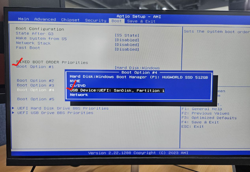 다음과 같이 Boot Option #1에 USB Device가 설정되면 됩니다.