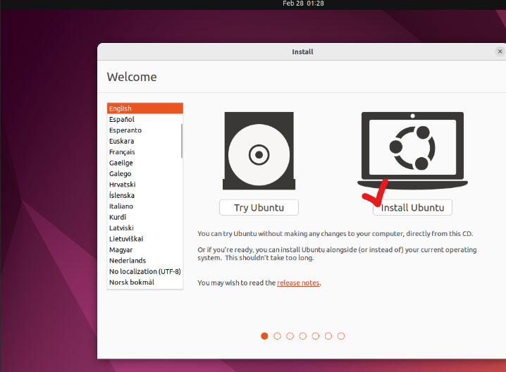 Install Ubuntu를 선택해 주세요. ( 저는 영어공부도 할 겸 영어로 선택했습니다. )