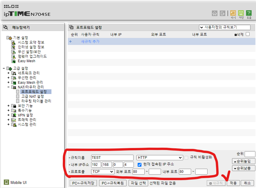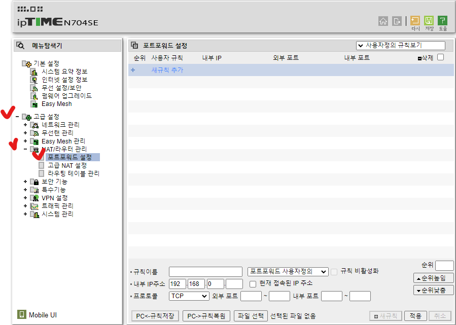 고급설정 > NAT/라우터 관리 > 포트포워드 설정으로 접근합니다.