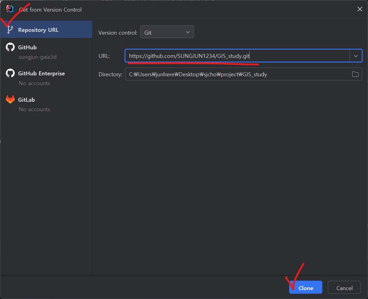 3. Repository URL -> URL 붙여 넣기 -> Clone