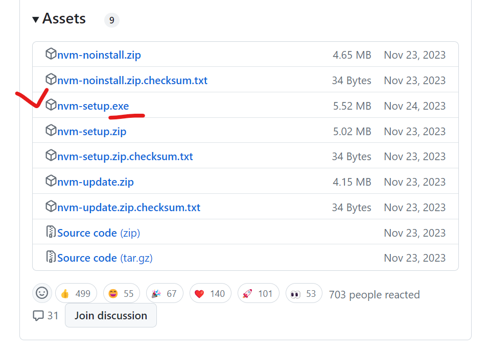 스크롤을 내리다 보면 나오는 nvm-setup.exe 파일을 다운로드합니다.