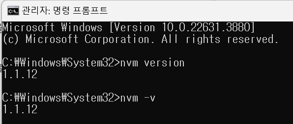 cmd창에서 nvm version을 입력해 nvm이 정상적으로 설치됐는지, 버전은 몇인지 확인합니다.