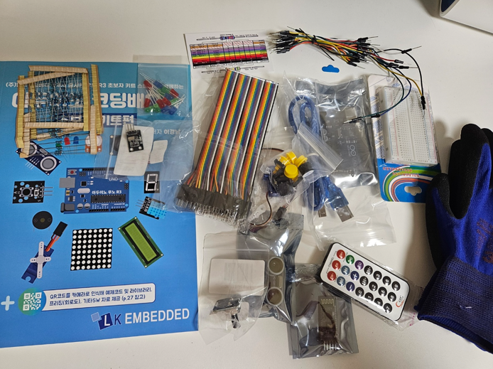 구매 후 키트를 열어보니 다양한 부품이 포함되어 있었지만 지금은 무엇이 무엇인지 잘 모르는 상태입니다.