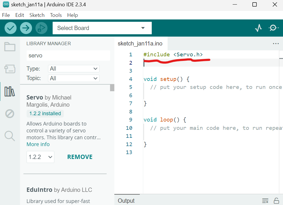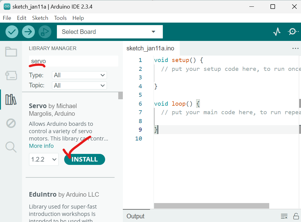 - "servo" 검색 - 첫 번째 Servo 라이브러리 설치