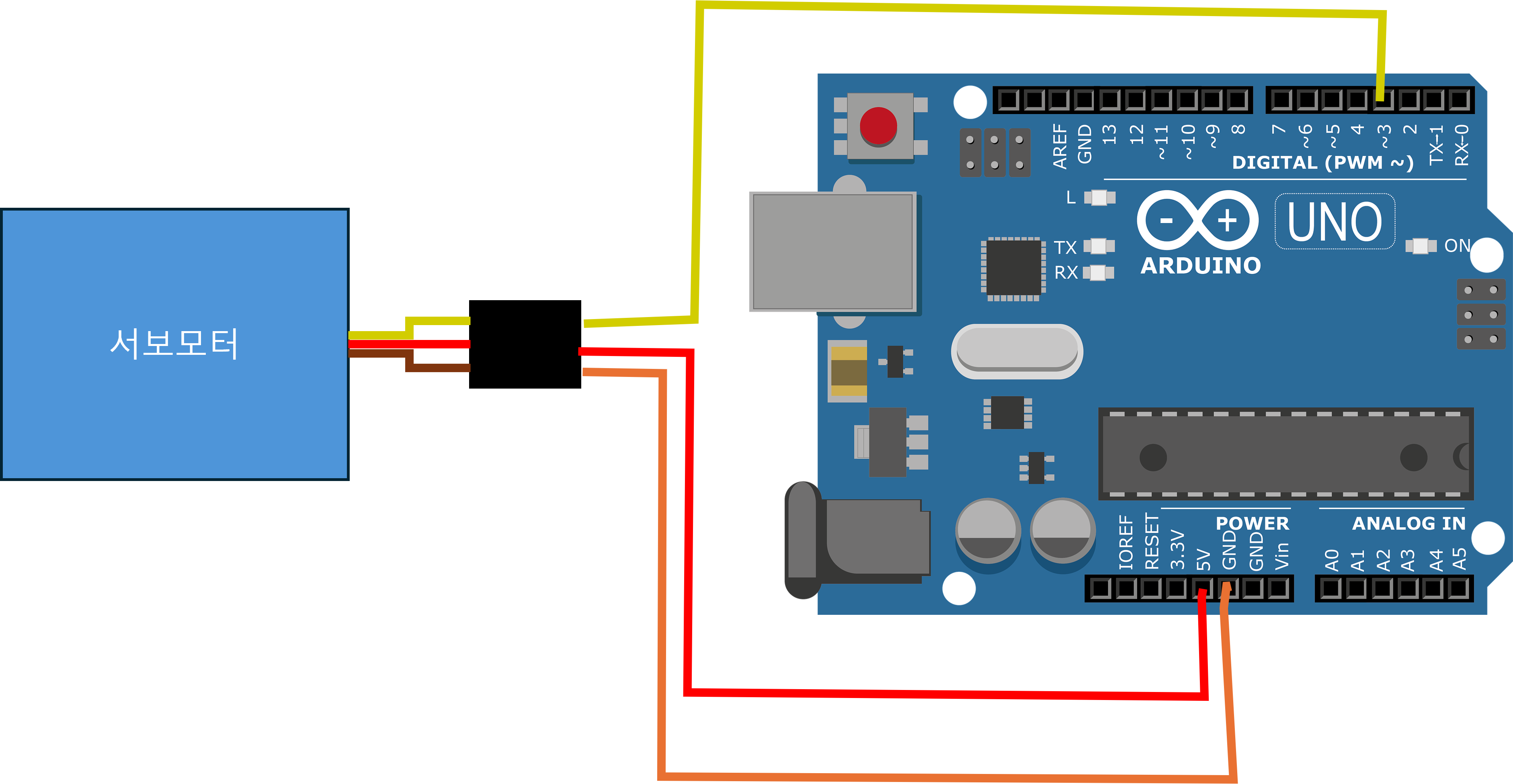 - 서보모터 노란 선 - 노란 점프선 - 아두이노 ~3 (디지털 핀 3)