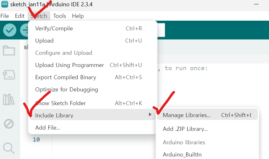 - 상단 메뉴 Sketch - Include Library - Manage Libraries...