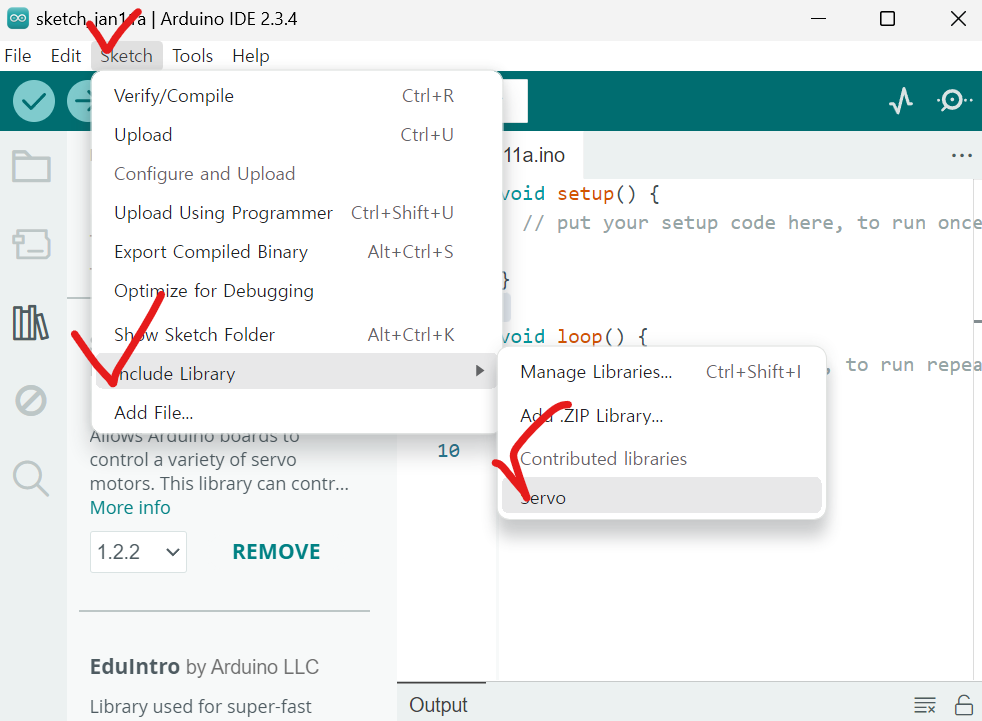 - 상단 메뉴 Sketch - Include Library - servo 클릭