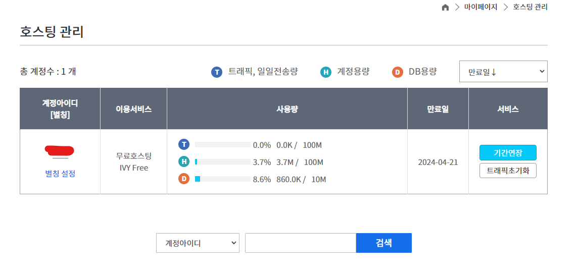 - 신청 완료 후 마이페이지의 호스팅 관리로 들어가 주면 다음과 같이 호스팅이 된 것을 알 수 있습니다.