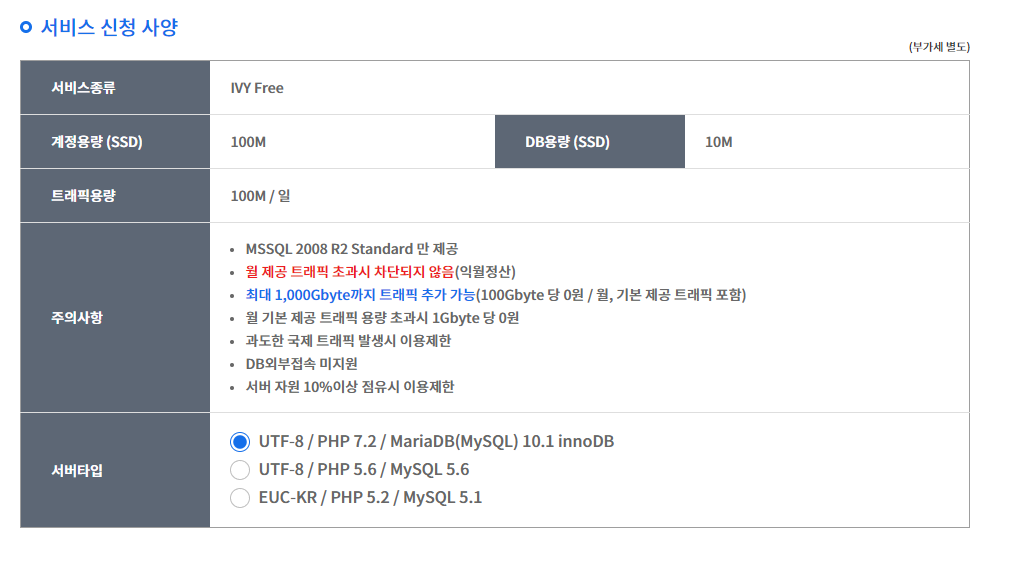 - 호스팅의 사양은 다음과 같으며 신청하기를 눌러줍니다.